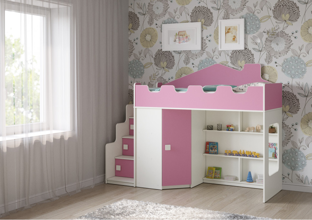 Эта модель кровати станет отличным выбором для вашего малыша. Благодаря угловой лестнице с дверцами и угловому шкафу, ребенок сможет легко и безопасно добраться до своего спального места, а также хранить свои игрушки и вещи в удобном месте.