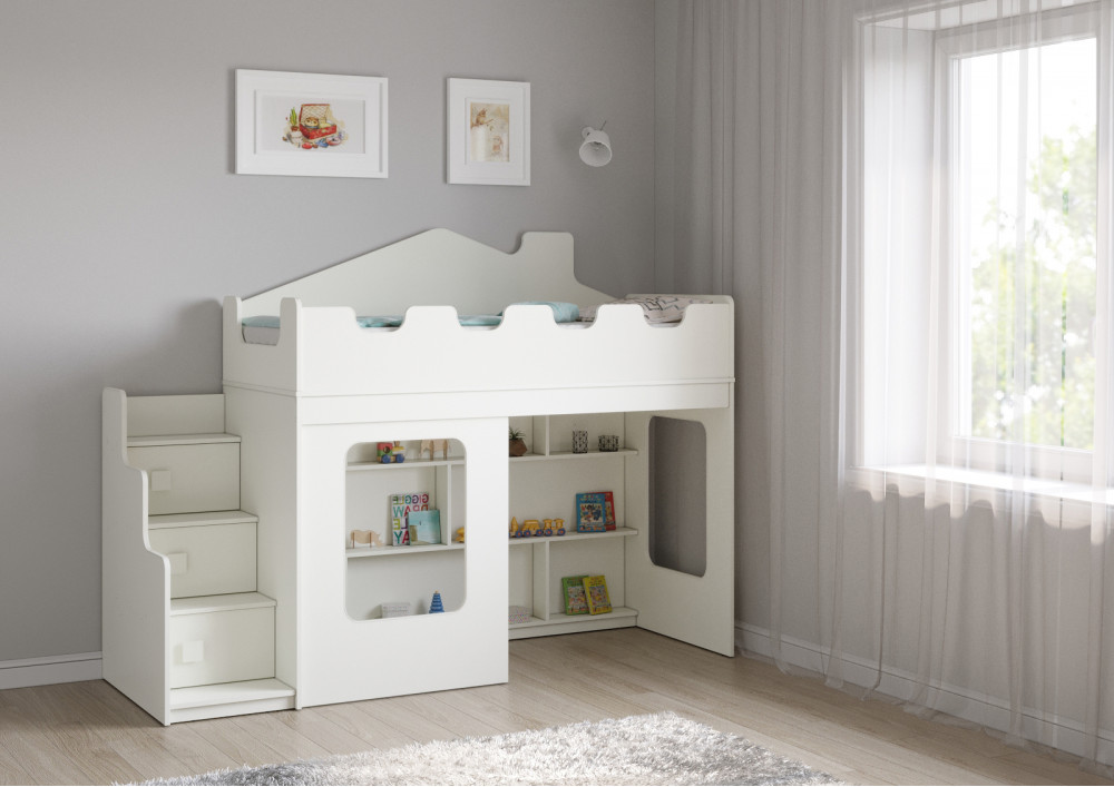 Кровать-домик “Легенда 43.3.1 с окном” станет отличным выбором для детской комнаты и сочетает в себе стильный дизайн, функциональность и безопасность для вашего малыша. Доступна в трех цветах: розовый, белый и лайм, она с легкостью впишется в любой интерьер. Угловая лестница с тремя дверьми обеспечивает удобный доступ наверх, а вместительный стеллаж предоставляет дополнительное место для хранения книг, игрушек и других мелочей.